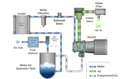 Unique water-injected twin screw element providing highly efficient near isothermal compression. The stainless steel rotors with optimized profile are supported by water-lubricated bearings, ensuring that no oil whatsoever can contaminate the compression element. The result is pure, oil-free air.